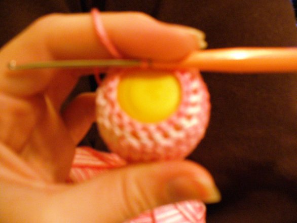 Tālāk vairs valdziņus klāt neliek un tamborē pa apli, it kā cilindru uz augšu. Jāpārliecinās,ka kinderolu būs iespējams ievietot tamborējumā.