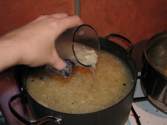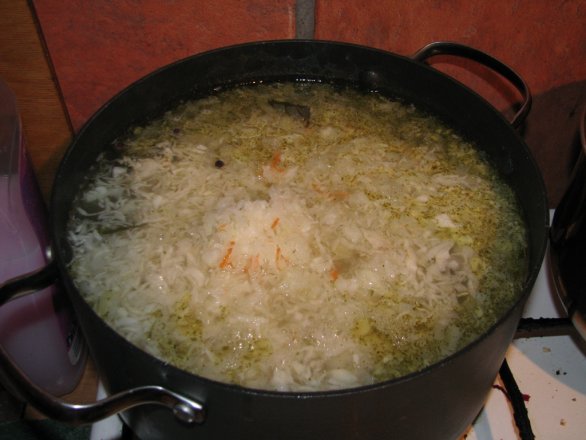 Kad gaļa ir pusmīksta, pievienoju apmēram 4-5 ēdamkarotes miežu putraimus un ļauju kādas 10-15 minūtes pavārīties. Tikmēr ņemu skābos kāpostus, pirms likšanas katlā nedaudz nospiež sulu un sagriež smalkāk, ja vēlas. Sulu nelej laukā!