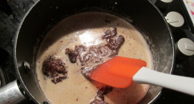 Katliņā izkausē sviestu, pievieno saldo krējumu un šokolādi, visu maisa līdz izkusis.